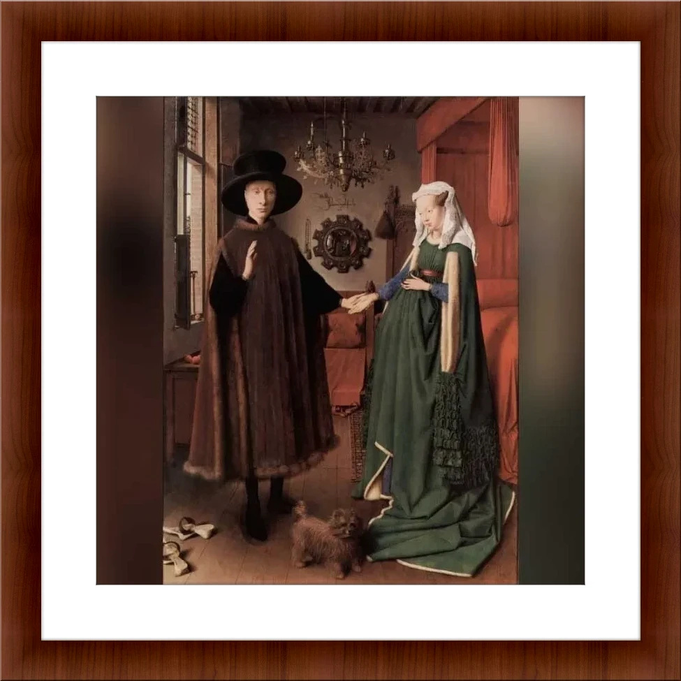 این اثر یکی از اولین نمونههای استفاده از پرسپکتیو و انعکاس آینهای است. صحنه ازدواج زوجی ثروتمند را نشان میدهد و جزئیات فوقالعاده لباس، جواهرات و فضای داخلی اثر را متمایز میکند.